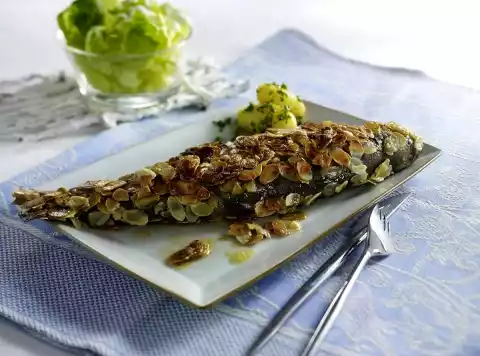 Then pull through the egg and roll in the almonds, press lightly. Heat the lard in 2 pans (if only 1 pan is used, first fry 2 trout, put them in the oven at approx. 50°C, then fry the other two).