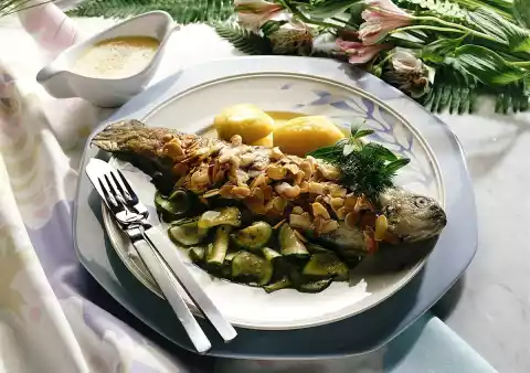 Froth the rest of the butter. Arrange the trout with the zucchini vegetables on plates. Sprinkle almond flakes over the trout and pour butter over them. Garnish with a bouquet of dill and tarragon.