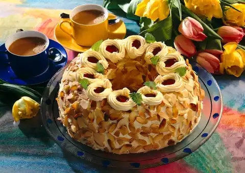 Put the pudding in a bowl, cover with foil and let it cool down. Roast the flaked almonds in a dry pan. Cut the almond wreath twice. Spread the lower and middle base with jelly.