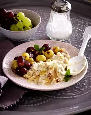 Wash the grapes, drain well and pluck them from the stalks. Heat a pan without fat. Caramelise the grapes in it with icing sugar and 1 tbsp honey. Arrange yoghurt and grapes on plates.
