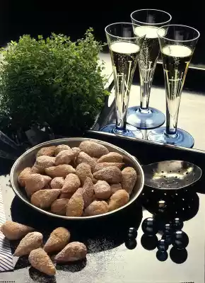 Heat the cooking fat in a high pot or deep fryer to 180° C. Fry the almonds in it in portions until golden brown. Drain on kitchen paper. Dust with icing sugar before serving.