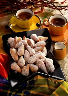 Chill the dough for about 20 minutes. Roll out on a floured baking board about 1 cm thick and cut into drop-shaped cookies with almond shapes (available in stores). Heat the cooking fat in a high pan or deep fryer to 175 ° C and fry the almonds in portions. Drain and dust with icing sugar