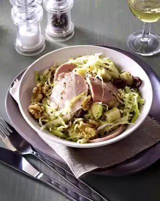 Cut the sausage into thin slices. Dice cheese. Rinse and drain raisins. Fold cheese, sausage, walnuts and raisins into the cabbage. Season to taste with salt and pepper. Arrange salad in bowls