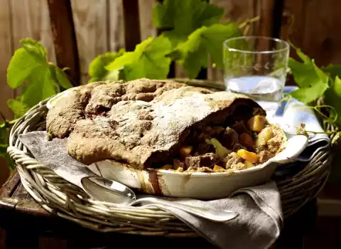 Clean the leek, wash it and cut it into rings. Peel and chop carrots. Peel, wash and dice the potatoes. Remove meat from the marinade. Layer with potatoes and vegetables in an ovenproof dish (approx. 3 litres capacity). Season with salt and pepper. Pour on the marinade, so that the form is filled to 2/3 with it. Possibly pour on some more wine