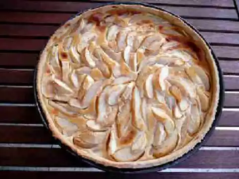 Knead the dough with your hands, form a ball and let it rest in a cool place covered with a cloth for one night. Line the tart base mould with short pastry. Prick several times with a fork. Cover with quartered, peeled and (for better baking) cut apples.