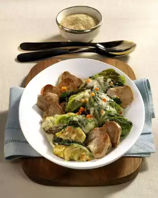 Clean the savoy cabbage, remove the stalk. Remove about 8 outer leaves. Cook in boiling salted water for 2-3 minutes. Quench, dab dry. Cut thick leaf veins flat. Finely chop about 100 g of the remaining cabbage (use the rest for other purposes).