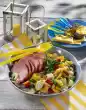 Lift out the pack, keep the stock. Fry the rest of the onions in 1 tbsp. oil. Sweat flour in it. Stir in stock and cream, bring to the boil. Simmer for 5 minutes, season to taste. Arrange everything, sprinkle with cheese. Served with: pork tenderloin
