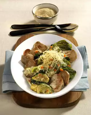 Deglaze with 300 ml broth and cook for about 5 minutes. Season to taste with salt and pepper. Wash parsley, dab dry and chop finely. Grate cheese finely. Mix amaranth, parsley, cabbage, carrots and 50 g cheese.