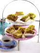 Fold the cherries into the remaining juice and carefully fold into the quark mixture to form a pattern. Chill for at least 3 hours. Heat the honey and brush the edges of the cakes with it. Put the pistachios in a small bowl and press the edges of the cakes into it. Shape the Amarena quark mixture into balls with an ice-cream scoop and spread on the cakes. Decorate with halved Amarena cherries. Warm up the remaining slightly gelled juice again and spread it over the cream balls