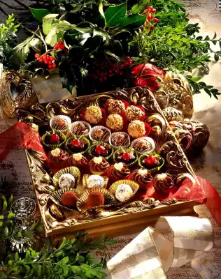 Allow the chocolate coating to draw a little. In the meantime cut the cherries in half with a sharp knife. Halve the pistachios as well. Press the stars carefully out of the plastic pallet and decorate with the cherries and pistachios. Place in paper praline cuffs as desired and serve