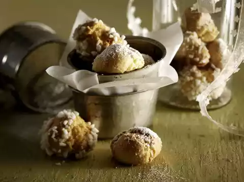 Sieve the icing sugar into a bowl. Add almonds, egg whites and baking oil and mix everything well together. Line 2 baking trays with baking paper. Form approx. 80 balls from the mixture with moistened hands. Turn half of the balls in sugar crystals. Spread the biscuits on the baking trays with some distance between them.