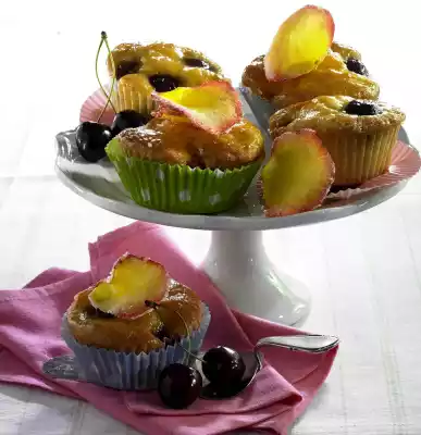 Wash, clean and stone the cherries. Cream fat, salt, vanillin sugar and sugar. Stir in eggs one after the other. Mix flour and baking powder and stir in alternately with the liqueur. Carefully fold about 2/3 of the cherries into the dough. Line the hollows of a muffin tray (12 hollows) with 1 paper sleeve each.