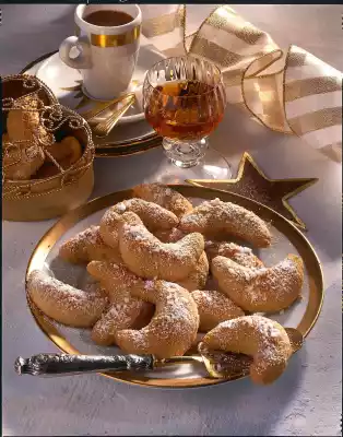 Roll and shape small pieces of dough into croissants on the work surface. Place on two baking trays lined with baking paper. Bake one after the other in a preheated oven (electric: 200 °C/ gas: level 3) for about 10 minutes, so that just the tips turn brown. Crumble the Amarettini very finely. Sift icing sugar. Mix with amarettini and remaining vanillin sugar and sugar crystals. Carefully roll hot croissants in it. Let it cool down on a cake rack. Keep the croissants well closed in tins in a cool place.