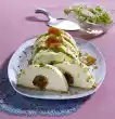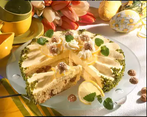 Now use a spoon or knife to spread waves into the cream from the edge of the cake to the centre. Press pistachios or almonds to the edge and sprinkle a little in the spaces between the waves. Put the cake in a cool place for 3-4 hours.