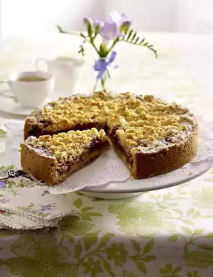 Pour the mixture onto the base, smooth it down and spread the remaining crumbles on top. Bake in the preheated oven (electric cooker: 175 °C/ convection oven: 150 °C/ gas: see manufacturer) for 40-45 minutes. Remove from the oven, place on a cake rack and let cool in the tin