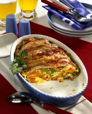 Line a flat casserole dish (approx. 24 x 16 cm) with bacon slices so that they protrude approx. 6 cm over the edge. Mix carrots, spring onions and parsley and fill into the dish. Pour egg dough over them. Place overlapping bacon on top. Cook the casserole in the preheated oven (electric cooker: 225 °C/ convection oven: 200 °C/ gas: level 4) for 25-30 minutes. Serve garnished with parsley
