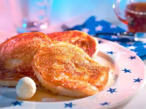 Layer buttermilk pancakes on top of each other and arrange with maple syrup and/or jam.