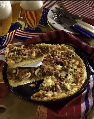 Put the flour in a bowl. Make a depression in the middle. Dissolve yeast and sugar in 200 ml lukewarm water. Pour into the hollow and mix with some flour. Cover and leave to rise in a warm place for about 15 minutes. Melt the fat. Add fat and salt to the flour and knead everything into a smooth dough. Cover and leave to rise in a warm place for another 30 minutes. In the meantime, heat oil in a pan for the topping. Fry the minced meat until crumbly. Season with salt, pepper and paprika. Clean, wash and slice the mushrooms. Cut ham into strips. Drain mozzarella and cut into thin slices. Grate Gouda. Knead dough again and cut in half. Put one half in a cool place. Roll out the other half to a circle (approx. 26 cm Ø) on a floured work surface. Place in a greased pizza or tart tin (26 cm Ø). Place 1/4 mozzarella and half each of minced meat, mushrooms, ham and gouda cheese on top. Place another 1/4 mozzarella on top. Bake in the preheated oven (electric cooker: 200 °C/ gas: level 3) for 20-25 minutes until golden brown. Bake a second pizza with the remaining dough and the remaining ingredients. Sprinkle with thyme as desired