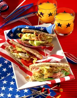 naise. Top with the rest of the lettuce, cheese, tomatoes and bacon. Sprinkle with fried onions and place 2 slices of toast on top. Halve all sandwiches diagonally