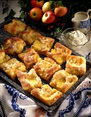 Warm milk, dissolve yeast in it. Mix flour, vanillin sugar, sugar, salt, egg and fat in flakes. Pour warm milk on top and knead into a smooth dough with the dough hooks of the hand mixer. Cover and leave to rise in a warm place for about 45 minutes. In the meantime peel apples, quarter them and cut out the core. Put apples, vanilla sugar, sugar, apple juice and cinnamon stick into a pot, mix and bring to the boil. Simmer for about 12 minutes at medium heat. Pour the compote into a bowl and let it cool down. Halve the yeast dough, knead again with floured hands and roll out one half in a greased fat pan (32x39 cm). Spread cooled apple compote on top. Roll out the rest of the yeast dough on a floured work surface to form a rectangle (32x39 cm), flour lightly, fold the sides down to the middle and place on the fat pan. Fold out the yeast dough again to a plate. Leave the cake to rise for another 20 minutes in a warm place. In the meantime, stir 4 tablespoons of milk, 25 g sugar and pudding powder until smooth for the topping. Bring the remaining milk to the boil, stir in the pudding powder and bring to the boil again while stirring. Let the pudding cool down a little while stirring. Press into the surface of the cake, close to each other. Distribute the pudding and fat in flakes in the hollows. Sprinkle with 50 g sugar and flaked almonds and bake in a preheated oven (electric range: 200 °C/ gas: level 3) for 25-30 minutes. Results in approx. 24 pieces