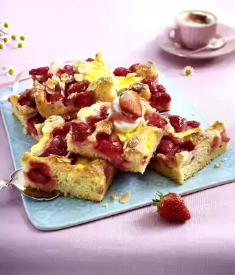 Press 125 g butter in pieces into the dough. Stir the pudding until smooth and spread it in patches on the dough. Spread strawberries on top. Sprinkle with flaked almonds and 100 g sugar. Bake in a preheated oven (electric cooker: 175 °C/ convection oven: 150 °C/ gas: see