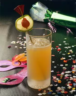 Put Amaretto and gin into a long drink glass and top up with well chilled bitter grapefruit. Add crushed ice. Put the lime slice and cocktail cherry on a skewer and pour into the glass