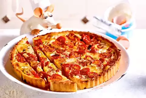 Take the tart out of the oven, remove peas and baking paper. Increase the oven temperature (electric cooker: 220 °C/circulating air: 200 °C/gas: see manufacturer). Pour the cream cheese mixture onto the tart base. Spread tomatoes and mozzarella on top. Bake for another 20 minutes.