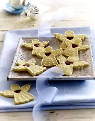 Mix flour, starch and baking powder and sieve into a bowl. Add butter in small pieces, sugar, vanillin sugar, salt and egg. First knead with the dough hooks of the hand mixer, then with cool hands quickly to a smooth dough. Wrap in foil and chill for about 1 hour. Roll out the dough on the floured work surface to a thickness of 3-4 mm. Cut out angels (about 7 cm long) and place them on 2-3 baking trays lined with baking paper. Bake the trays one after the other in a preheated oven (electric cooker: 200 °C/ convection oven: 175 °C/ gas cooker: level 2) for about 10 minutes.