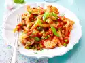 Meanwhile prepare the pasta in boiling salted water in 2-3 minutes. Drain and collect approx. 100 ml pasta water. Pour the collected pasta water and cream into the shrimp pan, bring to the boil and simmer for about 3 minutes at medium heat.
