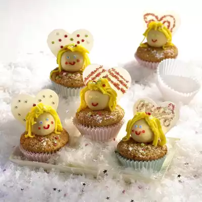 Knead marzipan with 25 g icing sugar. Colour 75 g marzipan for the hair yellow with food colouring. Form 8 heads from the remaining marzipan. For the wings, place a heart-shaped cutter (approx. 8 cm Ø) on the wafers. Press firmly on the wafer so that the contours are notched. Then cut out the hearts with scissors. Grind the hearts with white sugar writing and decorate them with decorative sugar and sugar pearls. Leave to dry for about 30 minutes. Dust the muffins with icing sugar. Place the heads in the middle of the muffins. For the hair, put marzipan in portions through a garlic press, cut off and decorate heads with it. Paint the mouth with red sugar writing and stick confetti with white sugar writing as eyes and cheeks.
