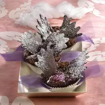 Spread the dough inside. Bake in the preheated oven (electric cooker: 200 °C/ convection oven: 175 °C/ gas: level 3) for 17-20 minutes. Remove from the oven and allow to cool completely. Cut 2 parallel columns into each muffin. Insert wings. Dust with pink coloured sugar and icing sugar