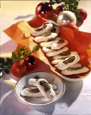 Beat egg whites until stiff. Gradually stir in icing sugar. Fold in almonds and aniseed. Pour the mixture in portions into a piping bag with perforated spout and spray 4-5 cm long strips onto 2 baking trays lined with baking paper.