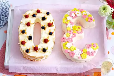 Place two number templates next to each other on the cake and cut out the cake. Set the cake remains aside for the petit fours. Cut the numbers in half horizontally and fill. Place the upper bottoms on top and press down slightly. Spread a thin layer of buttercream on all sides and chill for about 30 minutes. Decorate the cakes as desired.