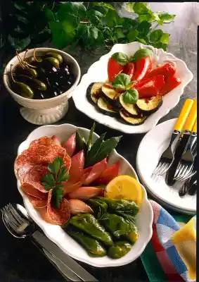 Season with salt and pepper. Let it boil down for about 10 minutes while turning constantly. Then drain. Drizzle red pepper and aubergine with some olive oil and serve garnished with basil. Mix green pepper with rosemary and lemon oil. Serve with shallots and salami. Garnish with parsley and lemon slice. Add black olives and capers to taste