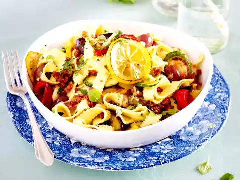 Drain the pasta, collecting approx. 200 ml of pasta water. Heat 1 tablespoon of oil in the pasta pot. Sauté garlic and tomato pieces for about 2 minutes. Deglaze with vinegar, then add fried vegetables, lemon, beans, olives, herbs and approx. 100 ml pasta water.