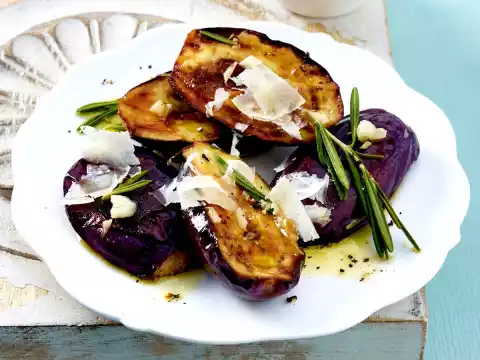 Arrange aubergines on plates and sprinkle with parmesan slices.
