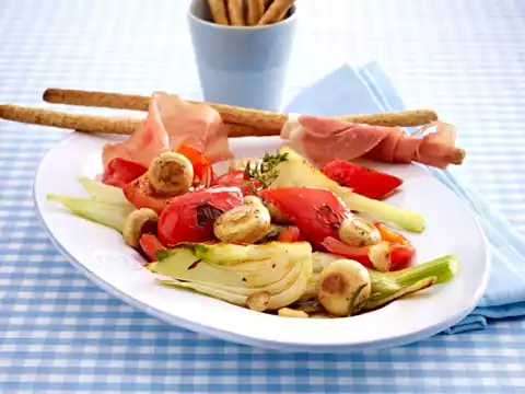 Heat the oil in a large frying pan and fry the vegetables vigorously while turning them. Add garlic, season with salt and pepper and sprinkle with sugar. Fry briefly until the sugar caramelises. Deglaze with vinegar and stock, add rosemary and thyme and braise covered for 4-5 minutes. Let the vegetables cool down in the pan. Arrange on a plate or small platter with ham and grissini