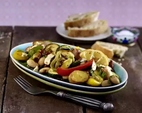 Mix basil, beans and mozzarella with the vegetables. Drizzle with vinegar and tomato oil. Season with salt and pepper and spread on a plate. Ciabatta tastes good with it.