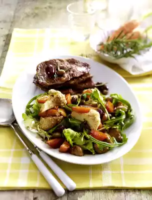 Pat the steaks dry. Fry in 2 tablespoons of hot oil in portions on each side for about 1 minute. Season with salt and pepper. Mix salads, vegetables and olives and season to taste. Serve with the steaks. Ciabatta goes well with it.