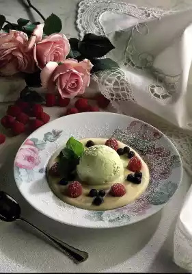 Cream egg yolk and icing sugar, up to 1 tablespoon. Add mascarpone and liqueur, stir and chill. Stir the mascarpone sauce again and divide it between 4 plates. Place 1 scoop of pistachio ice cream in the middle of each plate and decorate with fruit and mint. Dust with icing sugar