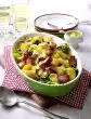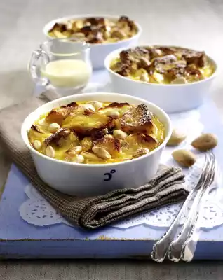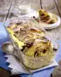Cut the rolls in half lengthwise and slice them. Wash apples, dab dry, peel, quarter, cut out core. Cut apples into thin slices. Mix milk, eggs, sugar, vanillin sugar and sauce powder. Layer bread and apples in 4 small, greased casseroles.