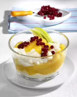 Drain the cranberries, pour over the rice pudding and decorate with apple wedges.