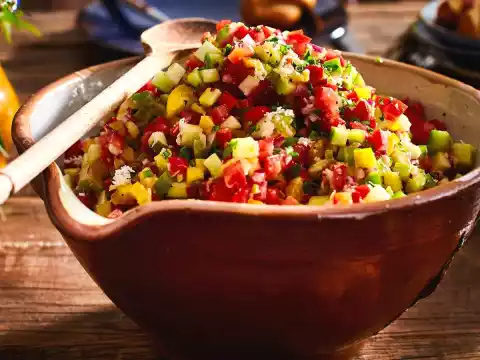 Clean, wash and finely dice the peppers. Peel and finely dice the onions. Wash, quarter, seed and finely dice the tomatoes. Wash, core and finely dice apples. Peel and finely grate horseradish. Wash chives and cut into fine rolls.
