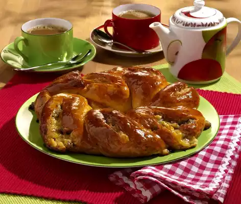 Cut the top side. Cover the wreath and let it rise for about 10 minutes. Bake in the preheated oven (electric cooker: 200 °C/ convection oven 175 °C/ gas: level 3) for 35-40 minutes. Take the baking tray out of the oven and let the wreath cool down a little. Bring the jelly to the boil while stirring and coat the warm wreath with it. Let the wreath cool down