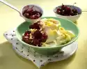 Knead butter, 150 g flour and 75 g sugar first with the dough hooks of the hand mixer, then with your hands to crumbles. Put the crumbles in a cool place. Put 300 g flour, baking powder, 75 g sugar, salt and vanillin sugar into a mixing bowl and mix.
