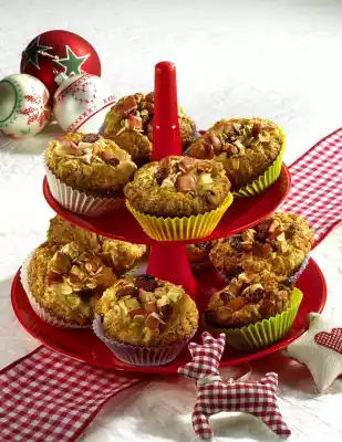 Line a muffin tin (12 troughs of 7 cm Ø each) with paper cups and spread the dough inside. Bake in the preheated oven (electric cooker: 175 °C/ convection oven: 150 °C/ gas: level 2) for about 25 minutes. Mix 10 g oat flakes, 20 g raisins and remaining apple cubes. After 15 minutes baking time, spread the mixture on the muffins and continue baking. Take out and let cool down