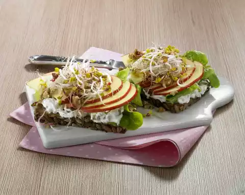 Mix the quark and 2/3 of the nuts and spread two slices of bread with it. Wash the lettuce leaves and dab dry. Place on the quark, then cover with apple slices. Sprinkle bread with radish sprouts and remaining walnuts.