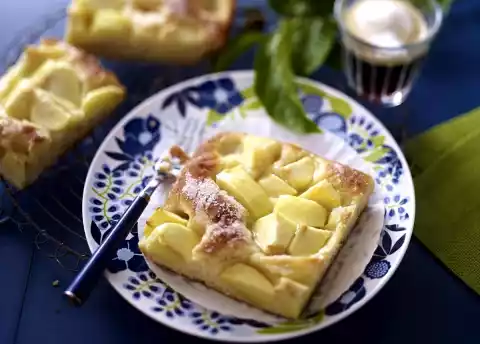 Spread apples and butter cubes in it. Sprinkle with 100 g sugar. Bake in a hot oven for about 25 minutes.