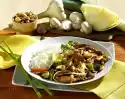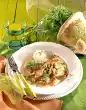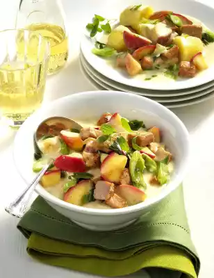 Heat the oil in a pot. Brown the meat all around. Season with pepper and take out. Sauté spring onions and apples in frying fat. Add meat again. Sprinkle with flour and sauté briefly. Stir in 3/8 l water, stock and oregano. Bring to the boil and simmer for about 5 minutes