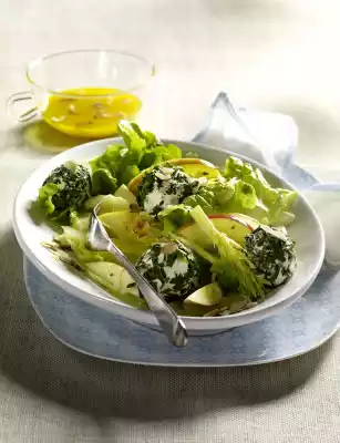 Clean, wash and roughly pluck the lettuce and drain thoroughly. Wash herbs, dab dry, remove coarse stems and chop leaves coarsely. Form small balls from the cream cheese with moistened hands and turn them in the herbs.